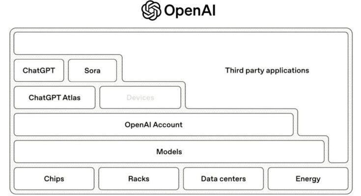 ثم هناك التطبيقات والأجهزة. ستستخدم جميعها الطبقات اللاحقة (التي يمكن وصفها بأنها “منصتها”). بعض هذه التطبيقات ستكون من OpenAI، مثل ChatGPT، Sora، ومتصفحهم الجديد Atlas، وفي النهاية أجهزتهم الخاصة. لا مفر من أن عرضهم سيكون مدعومًا بالكامل من “مجموعة” OpenAI وستقوم الشركة بدمج البرمجيات والأجهزة والخدمات بشكل عمودي. فكر في نظام Apple، ولكن مع محادثات عملائك، وتفضيلاتهم، وتاريخ الشراء كأصل أساسي.