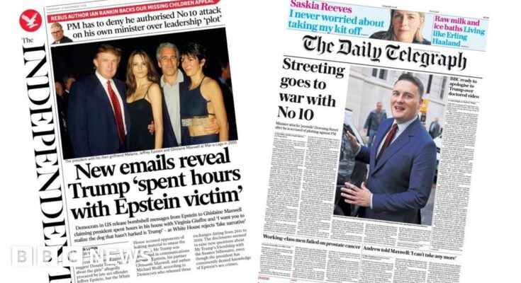 تصدرت الرسائل الإلكترونية التي تم إصدارها حديثًا حول دونالد ترامب وسلوكيات الراحل جيفري إيبستين عناوين الصحف يوم الخميس. جاء في عنوان صحيفة الغارديان: “كان يعرف عن الفتيات”، مشيرة إلى إحدى الرسائل التي أصدرتها الديمقراطيون في لجنة الإشراف بمجلس النواب. تحتوي الرسالة على مزاعم بأن الرئيس الأمريكي كان على علم بأنشطة إيبستين. وقد نفى ترامب باستمرار أي wrongdoing يتعلق بإيبستين.