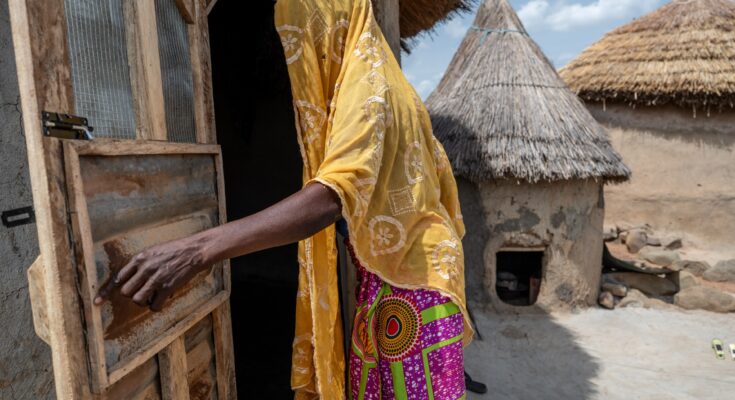 غامباگا، غانا — تجلس باشاليبانوا أنابيري على مقعد بلاستيكي صغير عند مدخل كوخها المصنوع من الطين. تتحرك قدماها العاريتان على الأرض الترابية بينما تعدل وضعها. ملابسها متسخة بفعل الغبار والوقت.