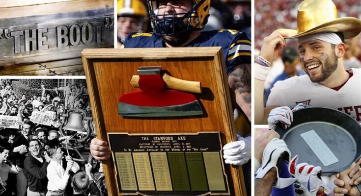 تتضمن بعض الجوائز الغريبة جوائز مثل تلك التي تُمنح في مباريات بين فرق مثل USC وستانفورد، حيث يتم تصميم الجوائز بشكل فريد يعكس روح المنافسة.
